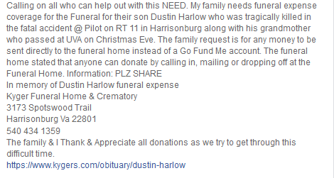 1/2/20 Post Update — The Harlow family requests assistance with funeral expenses during this very difficult time. If you would like to help out, please see the information below. Please consider helping this family by making a donation for funeral expenses to Kyger Funeral Home.